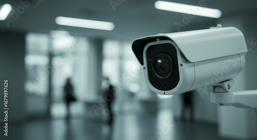 Security camera overlooking a hallway with people. Enhanced public safety through video surveillance technology.