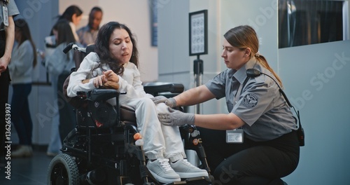 Security Checkpoint in Airport Terminal: Female Security Officer Inspects Woman in Wheelchair. TSA Screening Procedures. Worker Walks with Passenger with Physical Disability for Boarding Plane Flight.
