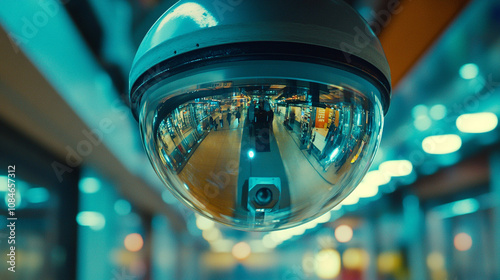 Security Dome Camera Reflecting Modern Shopping Mall Interior