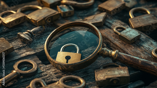 Security engineer identifying information security vulnerability in internet network system. Unlocked padlock icon and many other locked padlock icons. Hand holding magnifying glass.