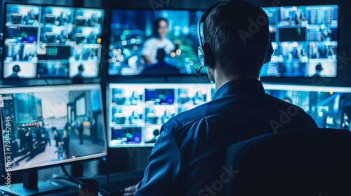 Security personnel monitoring CCTV feeds on multiple screens, intense focus, dark and modern control room