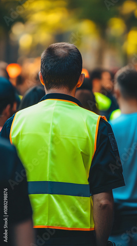 Security professional ensuring order and safety at a busy outdoor gathering, dressed in a high-visibility vest