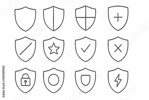Security shield line icon set. Protection, safety, privacy concepts. Vector guard symbols with checkmark, lock, star for UI, UX, web design. Editable stroke outline icons.