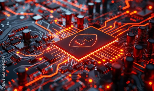 Security Technology Concept with shield symbol on a Microchip. Data flows from the CPU across a Futuristic Motherboard.