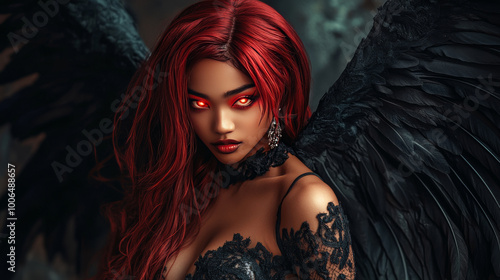 seductive winged woman with long red hair stares intensely, her eyes burning with an otherworldly fire.