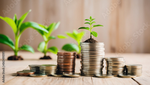Seedlings grow on coins lying on the desk. Green investment concept Collecting money to invest. Financial growth concept