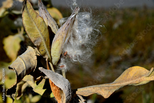 Seeds on gossamer strands of silk emerge from ripened milkweed pod