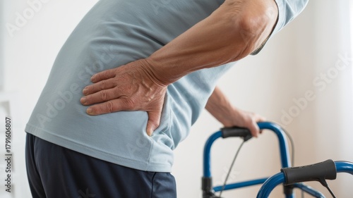 Seen from the side/back, hunched over slightly, with one hand pressed firmly against his lower back in a gesture of discomfort and relief.