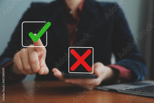 Select the check mark on a laptop. Check right and wrong marks. Concept decide to choose vote. Yes or no decisions, and business options for difficult situations in dilemma.