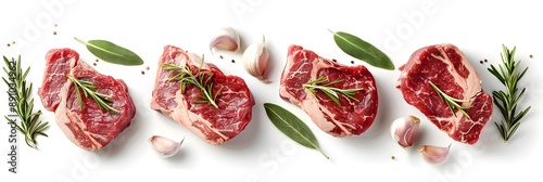 Selection of raw marbled beef steaks with garlic and rosemary, isolated on white