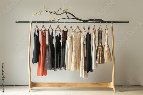 Selection of stylish dresses on a sleek wooden clothes rack against a neutral background