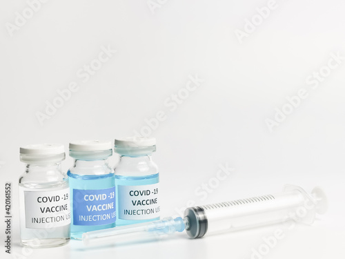 Selective focus COVID 19 VACCINES variant with syringe isolated on white background.