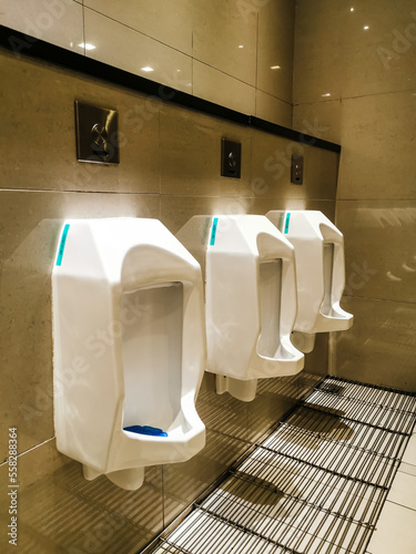 Selective focus image with noise effect white porcelain urinals in public toilet.