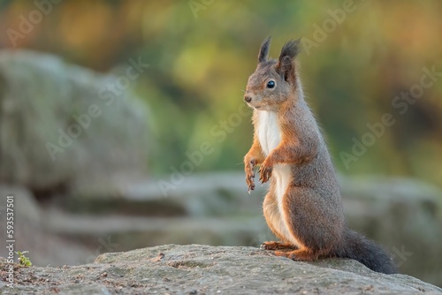 Selective focus of a red squirrel sitting on the stone with blurred background