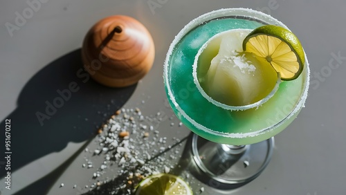 Selective focus of alcohol margarita cocktails with lime pieces and wooden squeezer on grey surface on white
