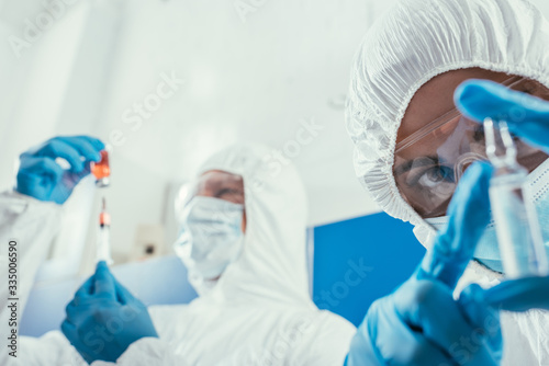 selective focus of biochemist looking at ampule near colleague taking medicine with syringe