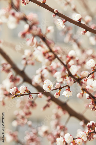 selective focus of blooming flowers on tree branches in sunlight