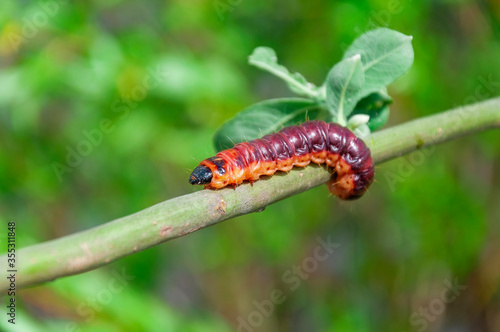 Selective focus of Cossus cossus caterpillar walking on branch, Goat moth