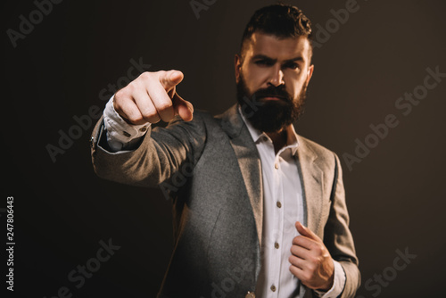 selective focus of handsome beard businessman pointing at you isolated on brown