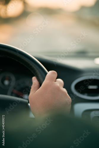 Selective focus of man's hand on steering wheel, driving a car at sunset. Travel background with copy space area.