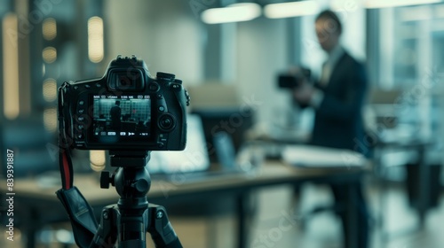 selective focus of professional digital camera near businessman recording video content in office generative ai