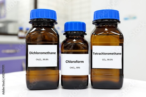 Selective focus of pure dichloromethane, chloroform and tetrachloromethane liquid chemical compound set in dark glass bottles inside a chemistry laboratory with copy space. Set of industrial solvents.