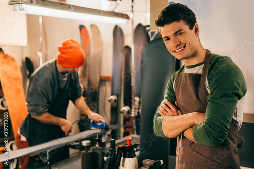 selective focus of smiling worker with crossed arms and his colleague using wax iron in repair shop