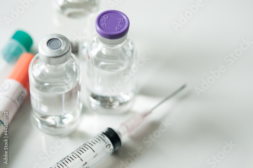 Selective Focus of Syringe and Medicine in vial , ready for vaccine injection , Cancer Treatment , Pain Treatment and can also be abused for an illegal use, healthcare and medical concept vaccination.
