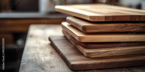 Selective focus on a stack of various wooden cutting boards placed on a wooden table.