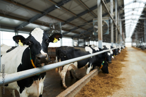 Selective focus on black-and-white milk cow looking at camera while standing in cowshed against row of other cattle eating fodder