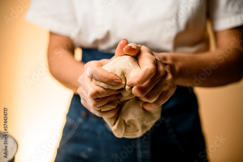 Selective focus on female hands and fingers which masterfully and vigorously knead raw bread dough