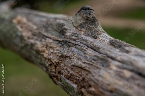 Selective focus on termite damage on branch, close up with rows of damage shown