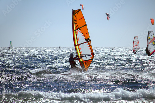 Selective focus on windsurfer on choppy sea glistening in the sun withe wave in front, in backlight (El Medano, Spain)