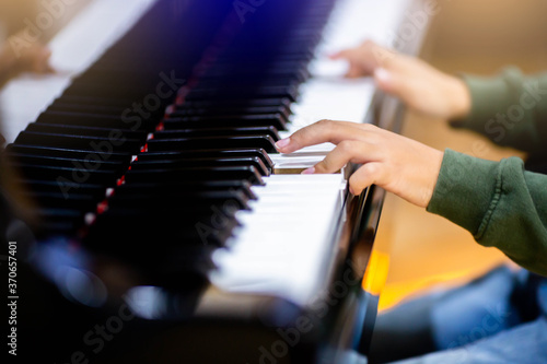 Selective focus to kid fingers and piano key to play the piano. There are musical instrument for concert or learning music. Close up hand of child musician playing the piano on stage.