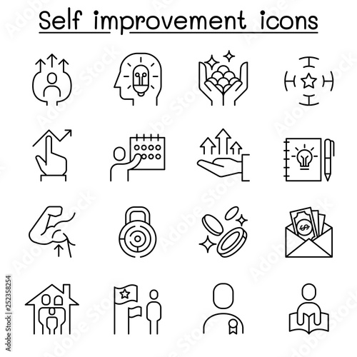 Self improvement, aim, target, development, planning, strategy icon set in thin line style