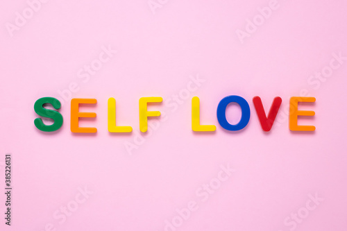 Self love text on pink paper background made from colorful plastic letters. Multicolored inscription on the banner. Title, headline. The psychology concept. The message on the poster, the words.