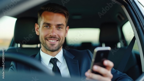 Self-assured and accomplished. Close-up of a young man in a formal suit using his smartphone while seated in a vehicle.