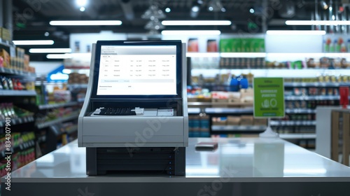 Self-Checkout Station: A self-checkout station in a supermarket with an empty screen or area for adding text or graphics