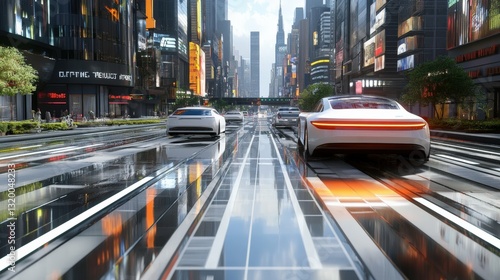 Self-cleaning roads with built-in dirt repellent technology, futuristic urban landscape, ultra-clean streets