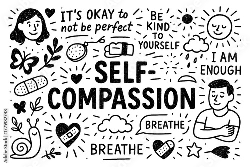 Self-compassion concept with kindness, acceptance, and self-love symbols in black and white doodle style, Transparent Background