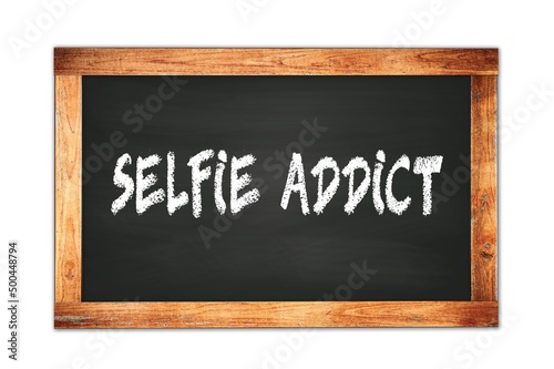 SELFIE ADDICT text written on wooden frame school blackboard.