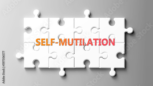 Self-Mutilation complex like a puzzle - pictured as word self-mutilation on a puzzle pieces to show that self-mutilation is complex and needs cooperating pieces that fit together. ,3d illustration