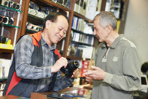 Seller demonstrating photo camera to buyer