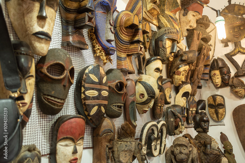 Selling Of African Souvenirs on A Stall At The Market On Blurred Background