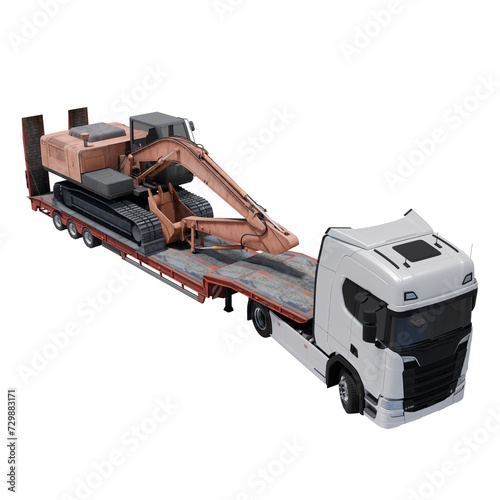 Semi Truck with Lowboy Platform Trailer 3D rendering on white background carrying an Excavator