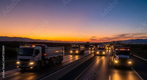 Semi trucks with bright headlights driving on a desert highway at sunset. Commercial transportation. Road freight delivery. Logistics industry.