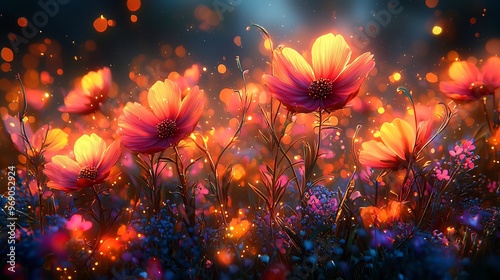 Semiabstract field of glowing wildflowers and swirling neon vines with each bloom radiating vibrant energy symbolizing natures vitality
