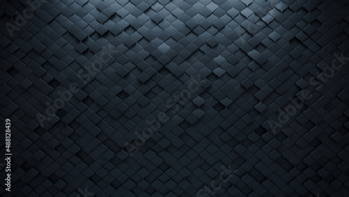 Semigloss Tiles arranged to create a Futuristic wall. Arabesque, 3D Background formed from Black blocks. 3D Render