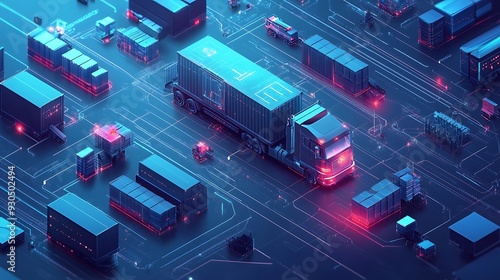 Semi-truck transporting cargo containers on a futuristic digital network.
