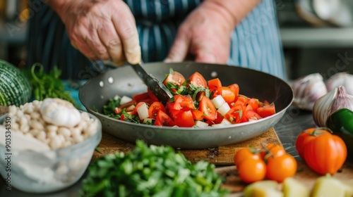Senior adult attending a cooking workshop preparing a healthy meal using fresh produce and whole grains on the kitchen counter